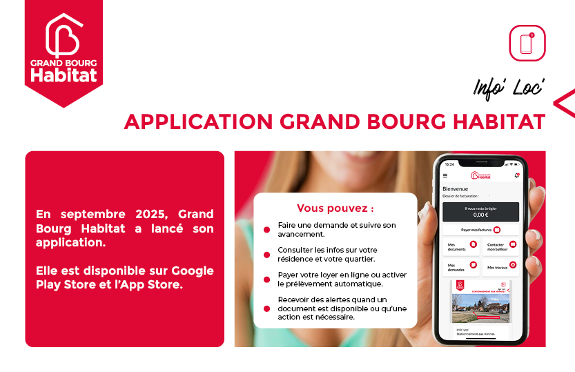 En septembre 2025, Grand Bourg Habitat a lancé l’application « Grand Bourg Habitat » disponible 24h/24 et 7j/7 depuis votre smartphone.